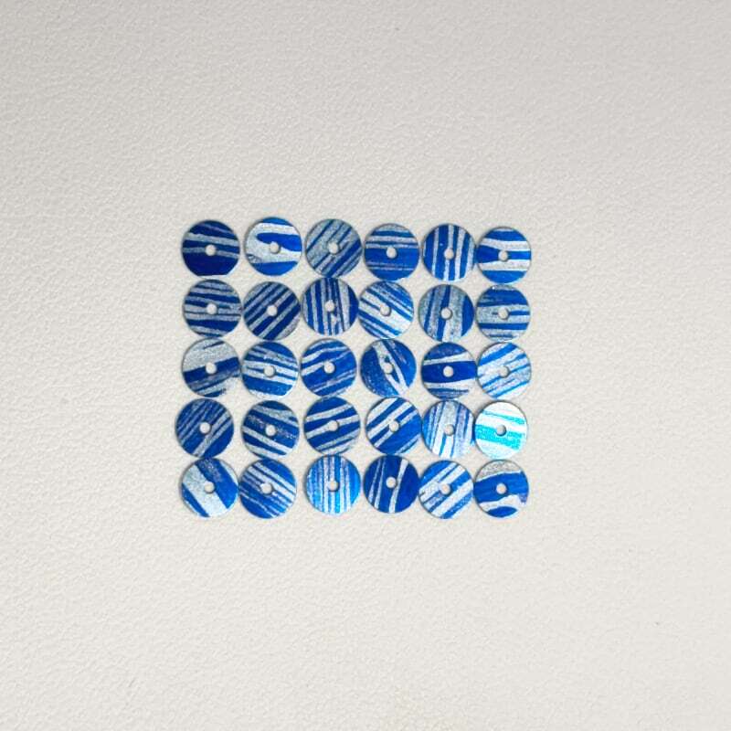● Flat sequins 5mm, in Metallic aspect Silver Marbling on Blue N° 2036 colour base.