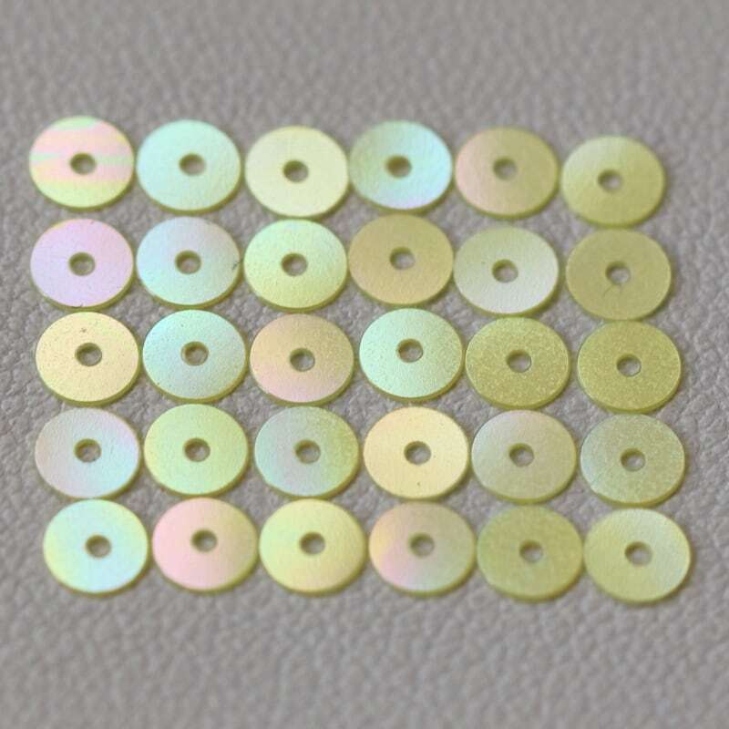 ● Paillettes et Cuvettes 4mm, Aspect perle satiné avec effet arc en ciel Coloris Jaune clair N° 4655.
